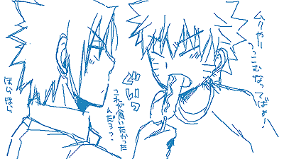 9月4日夜、者の書発売で一人勝手に盛り上がっていた絵チャ室に、素敵な皆様がやってきてくれました! 者の書を読んだ方だけでなく、ネタバレをものともしない方まであれよあれよと来てくださって、 @。さん、あすさん、A次郎さん、shihoさん、未理さん、ゆきなさん、私でとりあえず軍服を思い思いに(笑)描こうという事になりました。 ![]() 左から@。さん、A次郎さん、あすさん、shihoさん。 分割線はshihoさんにお願いしちゃいました! 日本軍人っぽかったり種っぽかったり(笑)ドイツ(?)っぽかったりカジュアルな軍服(キッシー談)っぽかったり。 ちなみにあすさんのサスケが「うわーどっかにいそう」と思いました(笑)。部下はナルトで! ![]() 二回戦目。一回戦目の途中でいらっしゃった与作さんにも参加していただきました。 (あすさんは途中で退室…。ありがとうございました!) 左から私、ゆきなさん、与作さん、未理さん。 素肌軍服はえろいね!って話をしていたので、ここはもう未理さんに描いていただくしかないという事に(笑)。 さ す が で し た 。 ゆきなさんは注連縄まで忠実に再現!!与作さんのはもう、かわいいんだけど笑顔で斬り掛かってきそうでこわい!って感じでした(笑)。 私のはただのノリなんで深い意味は無いです。 この後最近雨と雷(麒麟)がー…とか雨のせいで者の書が入荷されてなかったーとかイベント系は地方じゃさっぱりだ! とかそんな話をしている間に時間が過ぎ、未理さんと与作さんが退室。遅くまでありがとうございました。 ちなみに次の大阪こそはフランクフルトを食べよう!と言っていた時の落書き。(shihoさんと私) いたたまれないので小さくした(笑)。 ![]() そしてだらだらしゃべっていた時に颯希さん登場! 者の書の話でにわかに活気づく(笑)。(今まで脱線しすぎていた!) イタチの好物があーだこーだ話していたら、颯希さんの手により、みるみるキャンバスがメルヘンになっていきました。さすが! ![]() ちなみにサスケとイタチを好物で釣って、一網打尽みたいな感じだったんですが、 結局ナルトごと網の中に入れられてナルトピンチ!という展開になっていきました。 もうキャプしきれないぐらいの怒濤の展開でした(笑) 途中ゆきなさん、shihoさんが退室されたんですが、shihoさんの残していったイラストにはこんな加工がなされていきました…(笑)。 ![]() ![]() 最終的にカカシ先生は現品で10両、その後大蛇丸に買われていきましたよ。不憫(笑)。 最後はA次郎さんがキツネっこを描き始めたのをきっかけにハーレム作成! ![]() 左から、サスケ(真ん中お膝のちまっこいのもv):颯希さん、ナルト:私、A次郎さん、@。さん。 「今日はだれにしようか」とものすごく真剣にお悩みのサスケ氏でした(笑)。 ナルト左のシリを触りながら、ナルト真ん中の生足を凝視、心はナルト右の事を考えているらしいです。 この後脱ごうとしたサスケだったけど、ナルトが無垢だったので思いとどまったそうな(笑)。 そんなこんなで最後は者の書関係ない絵になりましたが(*´▽`*) 6時近くまでおつき合いしていただきありがとうございました!! また機会があったら遊びたいですv |
